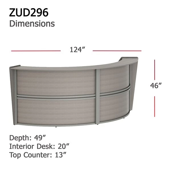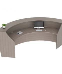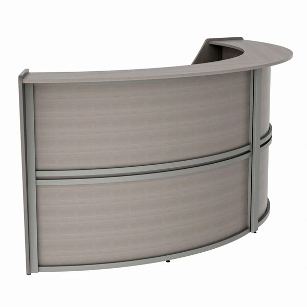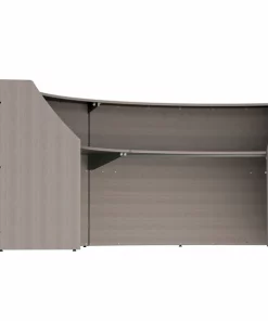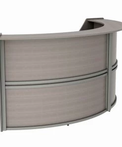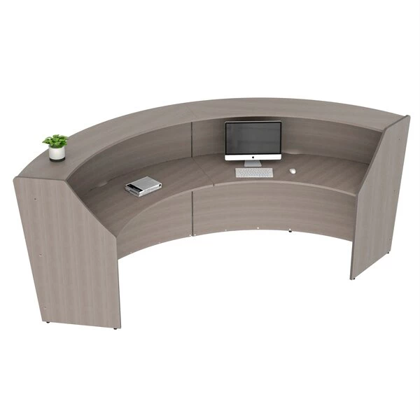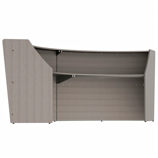 Linea Italia Curved Modern Reception Desk with Counter, 2 Units, Reception Station. Reception Desk Dimensions: 124”W x 49”D x 46”H and 13"D in top counter and 20"D inside table. Strong metal frame and laminated wood body in Ash finish. Modern, comtemporary design for Lobby, Salon, Office, Hospital, Clinical Center, School, Secretary, Receptionist. Easy to Assembly, no tools required, leveling glides for uneven flooring. Expertly shrink wrapped and packed to avoid damage during transit.
