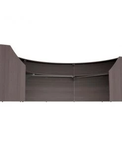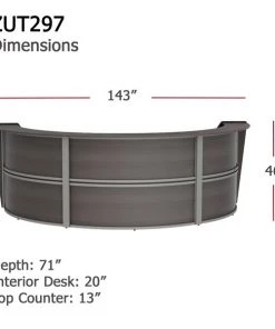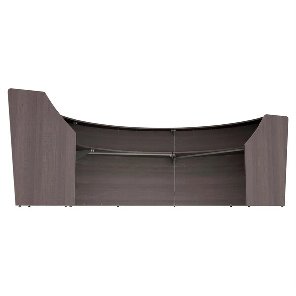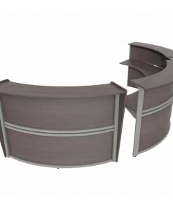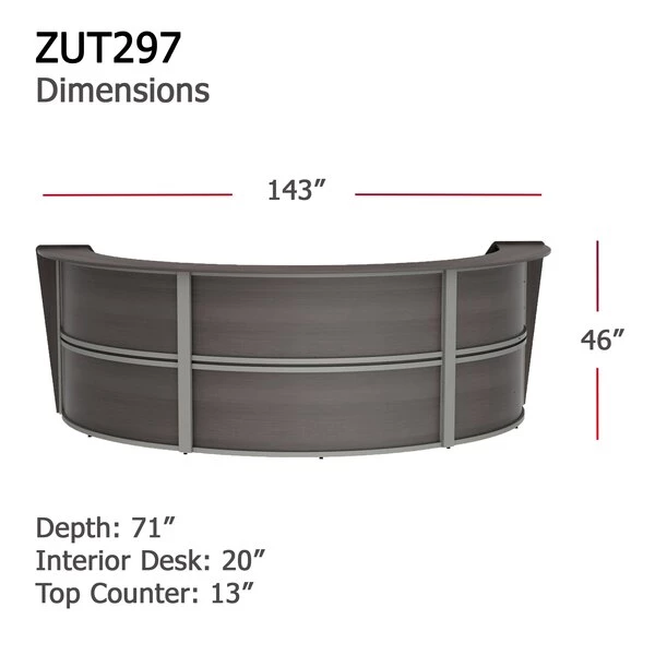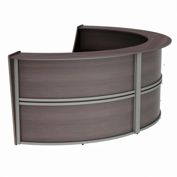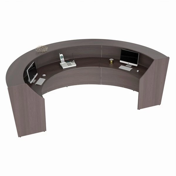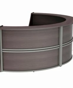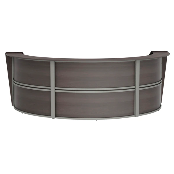 Linea Italia Curved Modern Reception Desk with Counter, 3 Units, Reception Station. Reception Desk Dimensions: 143”W x 71”D x 46”H and 13"D in top counter and 20"D inside table. Strong metal frame and laminated wood body in Mocha finish. Modern, comtemporary design for Lobby, Salon, Office, Hospital, Clinical Center, School, Secretary, Receptionist. Easy to Assembly, no tools required, leveling glides for uneven flooring. Expertly shrink wrapped and packed to avoid damage during transit.