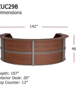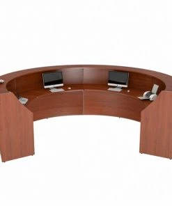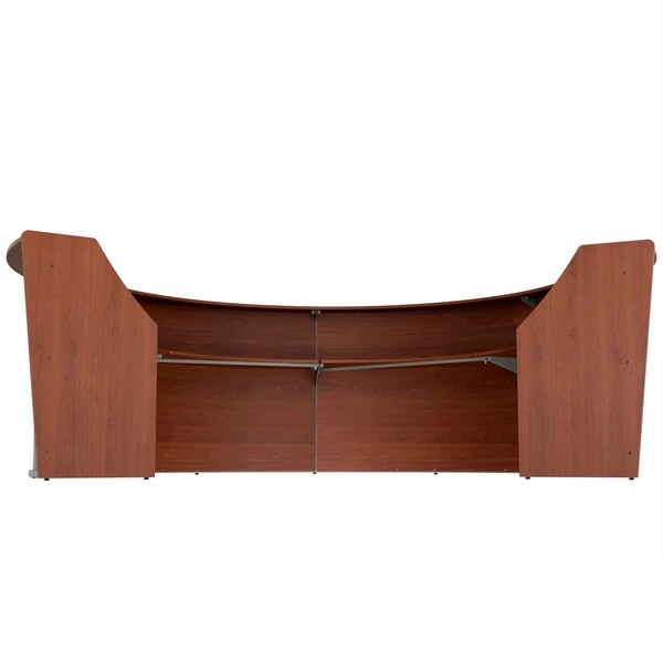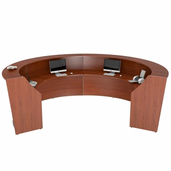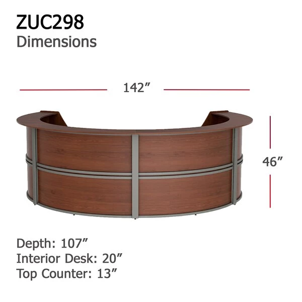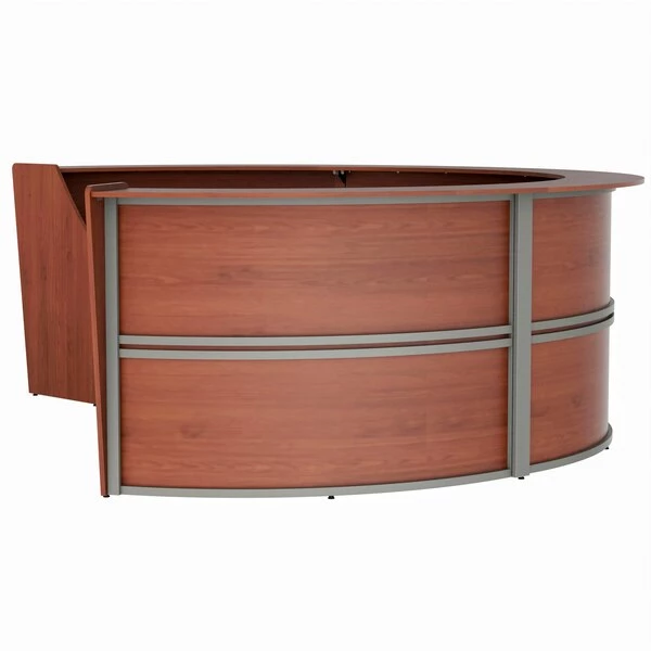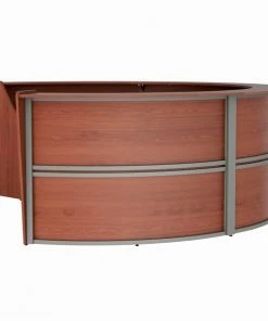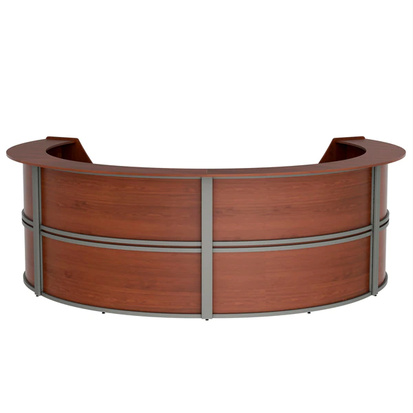 Linea Italia Curved Modern Reception Desk with Counter, 4 Units, Reception Station. Reception Desk Dimensions: 142”W x 107”D x 46”H and 13"D in top counter and 20"D inside table. Strong metal frame and laminated wood body in Cherry finish. Modern, comtemporary design for Lobby, Salon, Office, Hospital, Clinical Center, School, Secretary, Receptionist. Easy to Assembly, no tools required, leveling glides for uneven flooring. Expertly shrink wrapped and packed to avoid damage during transit.