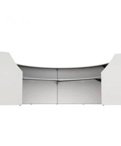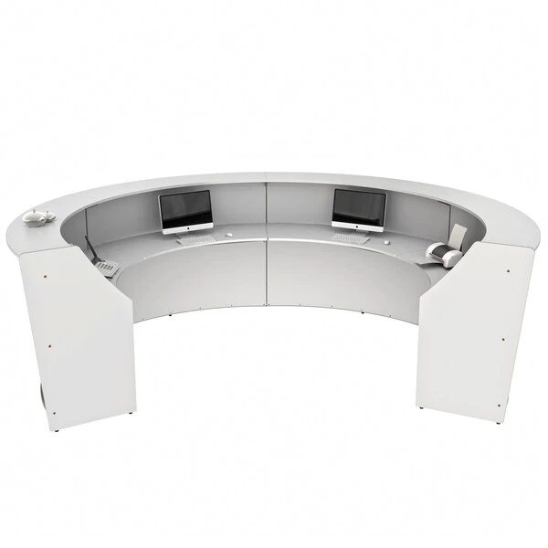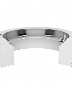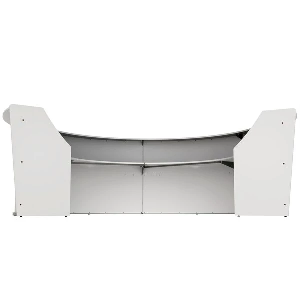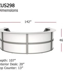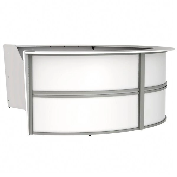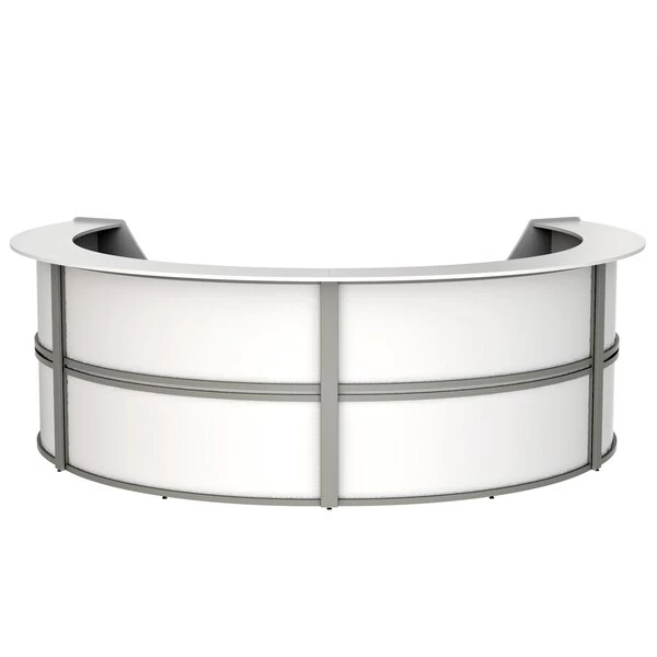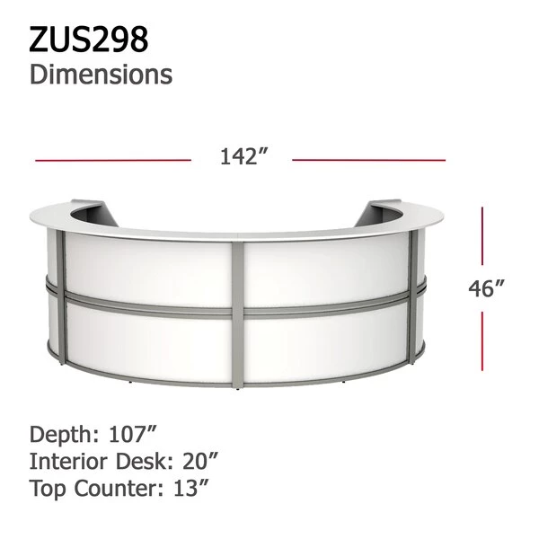Linea Italia Curved Modern Reception Desk with Counter, 4 Units, Reception Station. Reception Desk Dimensions: 142”W x 107”D x 46”H and 13"D in top counter and 20"D inside table. Strong metal frame and laminated wood body in White finish. Modern, comtemporary design for Lobby, Salon, Office, Hospital, Clinical Center, School, Secretary, Receptionist. Easy to Assembly, no tools required, leveling glides for uneven flooring. Expertly shrink wrapped and packed to avoid damage during transit.