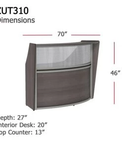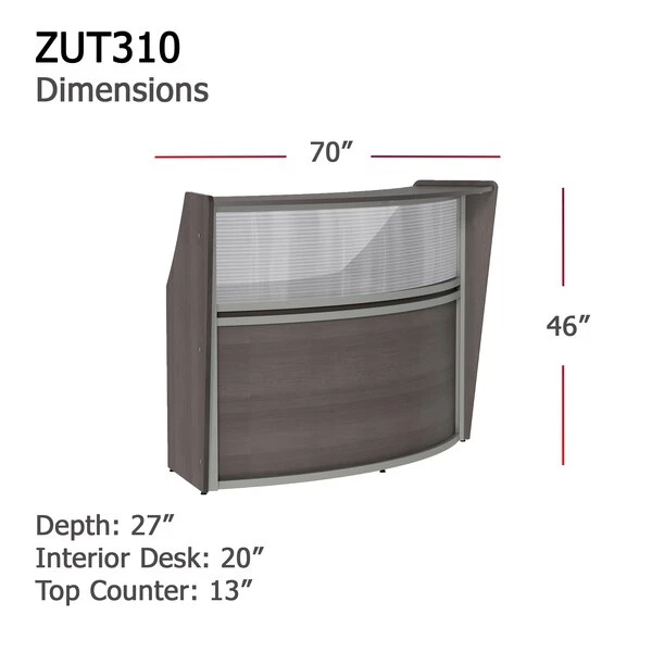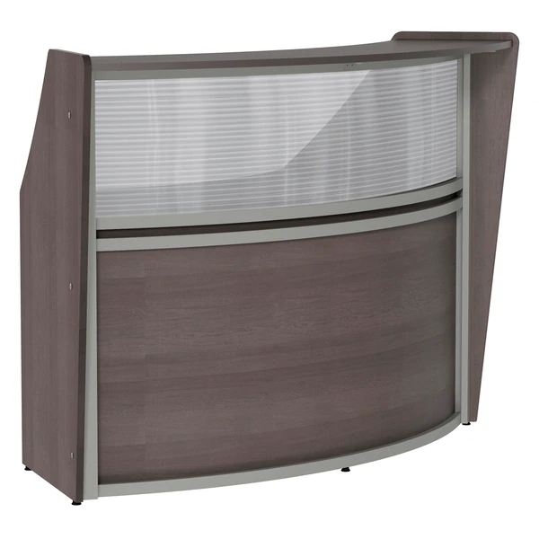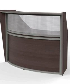 Linea Italia Curved Modern Reception Desk With Counter Clear Panel that allows ligth into desk area. Reception Desk Dimensions: 72”W x 32”D x 46”H and 13"D in top counter and 20"D inside table. Strong metal frame and laminated wood body in Mocha finish. Reception station, modern design for Lobby, Salon, Office, Hospital, Clinical Center, School, Secretary, Receptionist. Easy to Assembly, no tools required, leveling glides. Specially wrapped and packed to avoid damage during transit.
