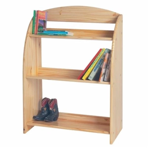 Shelves slant back to keep books neatly in place and to make them easier for little kids to take off and put back. They are spaced to accomodate large children's books and will hold up to 150 pounds per shelf. This bookcase is very sturdy and resistant to forward tipping. Make this piece even more special by personalizing it.Finish: Natural.All finishes are water based low VOC made by Sherwin Williams and other American manufacturers.Wood raw materials are from environmentally responsible suppliers.All packing insulation is 100% post consumer recycled.All shipping cartons are either 100% post consumer recycled or use recycled cardboard.Materials Solid Knotty Pine Wood.Dimensions: 27"W x 14"L x 3'3"H.