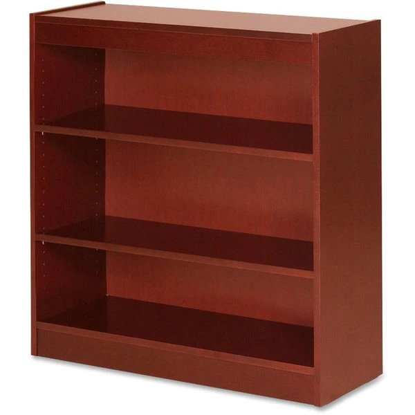 High-quality, veneer bookcase features a vintage square design. Solid, 3/4" thick shelves are adjustable on 1-3/4" centers with pinhole attachments, except for bottom shelf. Three-shelf bookcase has a laminate finish on the back's interior and an unfinished back side. Each shelf holds up to 110 lb.