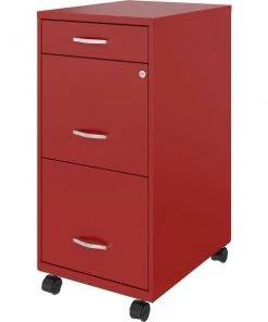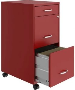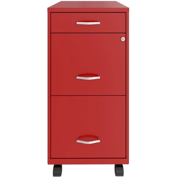 SOHO File Cabinet offers convenient storage of files and supplies with an accessory drawer on top and two file drawers with smooth-glide suspension. The accessory drawer is perfect for cell phones, tablets, cables and small supplies. Full high-side drawers accommodate letter-size, hanging file folders. The lock secures the two top drawers. Four casters allow you to move the pedestal where you need it. Three-drawer organizer also includes an 18" depth, recessed plastic handles and steel construction with a baked enamel finish.