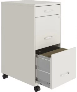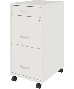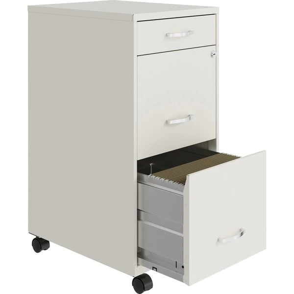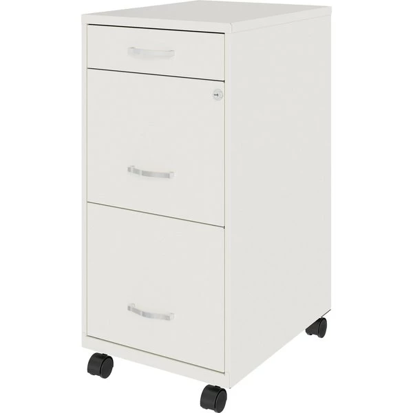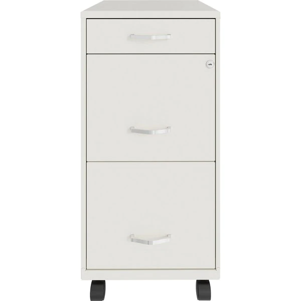 SOHO File Cabinet offers convenient storage of files and supplies with an accessory drawer on top and two file drawers with smooth-glide suspension. The accessory drawer is perfect for cell phones, tablets, cables and small supplies. Full high-side drawers accommodate letter-size, hanging file folders. The lock secures the two top drawers. Four casters allow you to move the pedestal where you need it. Three-drawer organizer also includes an 18" depth, recessed plastic handles and steel construction with a baked enamel finish.