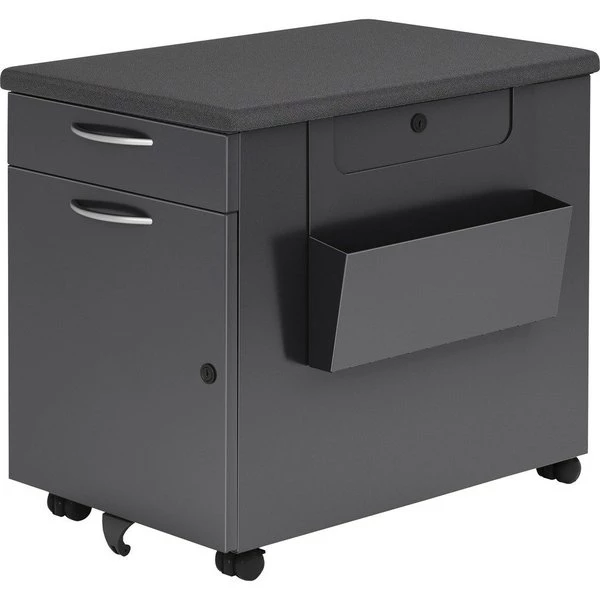 Chester Cabinet offers versatile personal storage for varied things you use at work. Lift the top to access landing pad for your devices and a storage well for your backpack, purse, gym bag or other personal items. The underside of the top features a markerboard panel. A file drawer and concealed personal drawer can help with the incidental filing and storage. The concealed top drawer is accessible when bottom drawer is open. Black cushion top provides a convenient spot for temporary seating. Cabinet is also equipped with a core-removable lock, satin nickel loop-pull front and fifth wheel on front to prevent tipping. Hanging side bin for active documents is sold separately.