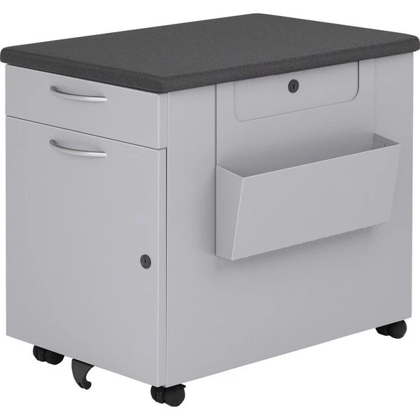 Chester Cabinet offers versatile personal storage for varied things you use at work. Lift the top to access landing pad for your devices and a storage well for your backpack, purse, gym bag or other personal items. The underside of the top features a markerboard panel. A file drawer and concealed personal drawer can help with the incidental filing and storage. The concealed top drawer is accessible when bottom drawer is open. Black cushion top provides a convenient spot for temporary seating. Cabinet is also equipped with a core-removable lock, satin nickel loop-pull front and fifth wheel on front to prevent tipping. Hanging side bin for active documents is sold separately.