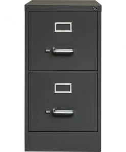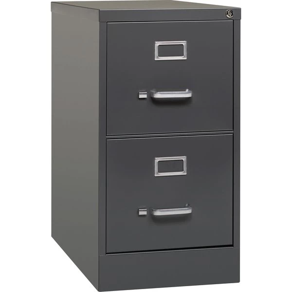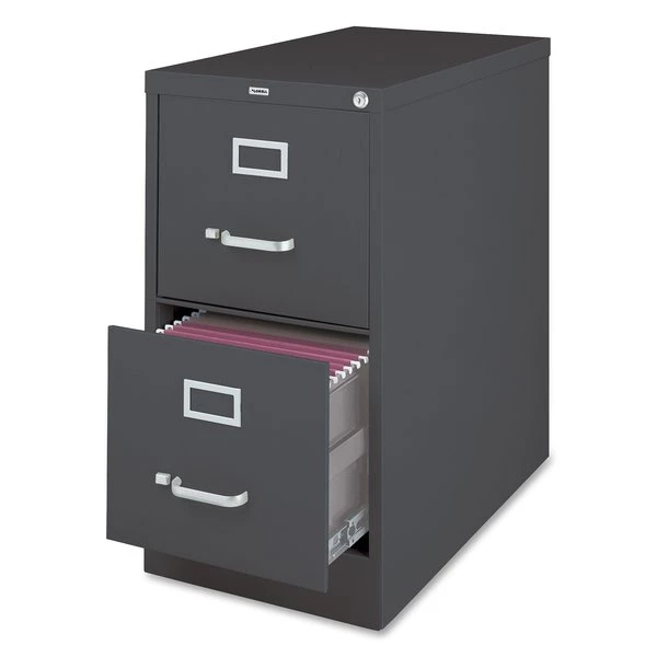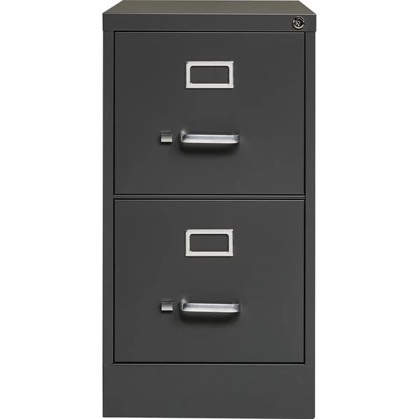 Commercial-grade vertical file features two high-sided drawers that accommodate letter-size, hanging file folders without additional accessories. Slide suspension allows maximum drawer extension. Steel ball bearings provide smooth, quiet drawer performance. Even fully loaded, these drawers open with ease. Adjustable wire followers keep files upright. 26-1/2" deep vertical file also features a core-removable lock for security, aluminum label holders for easy referencing, convenient pull handles and heavy-gauge steel construction with recycled content. Vertical file meets or exceeds ANSI/BIFMA industry standards.