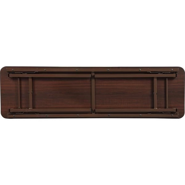 Folding banquet table offers a convenient 18" width for easy access to a spread of food or interactive presentations. Mahogany melamine top is 5/8" thick. Coil steel frame features a powder-coat finish for durability.