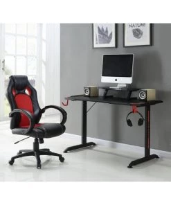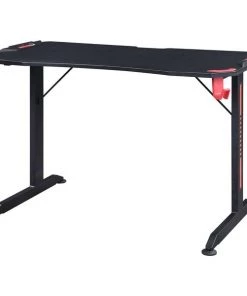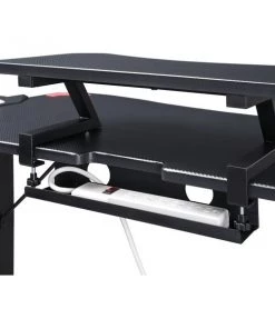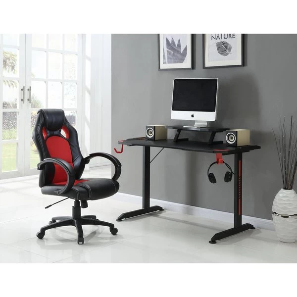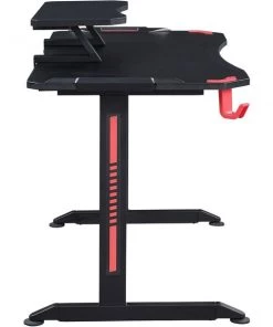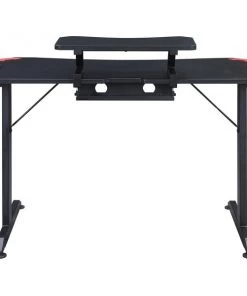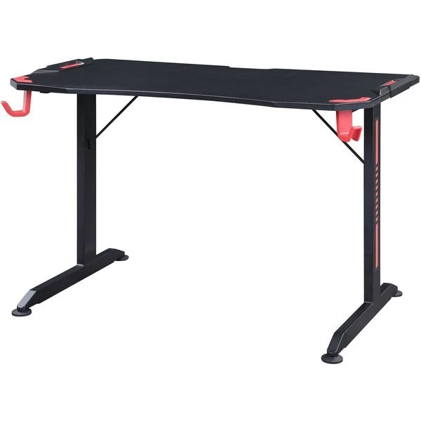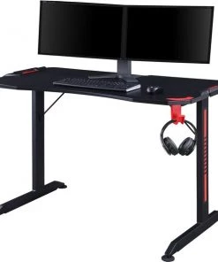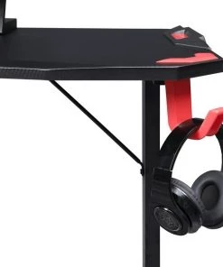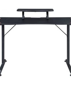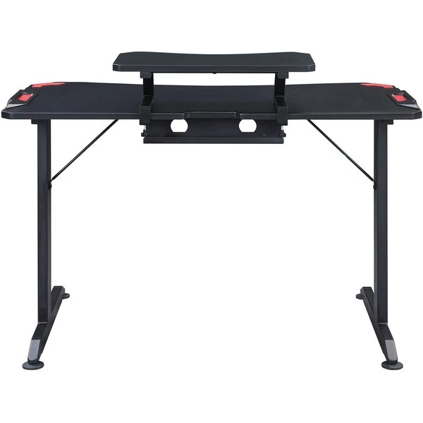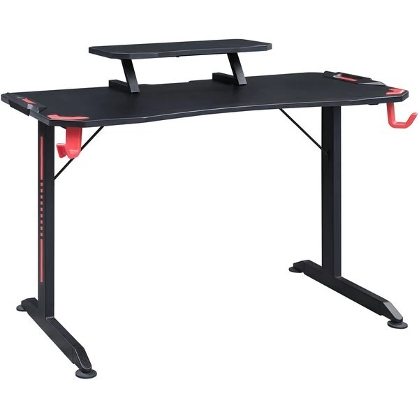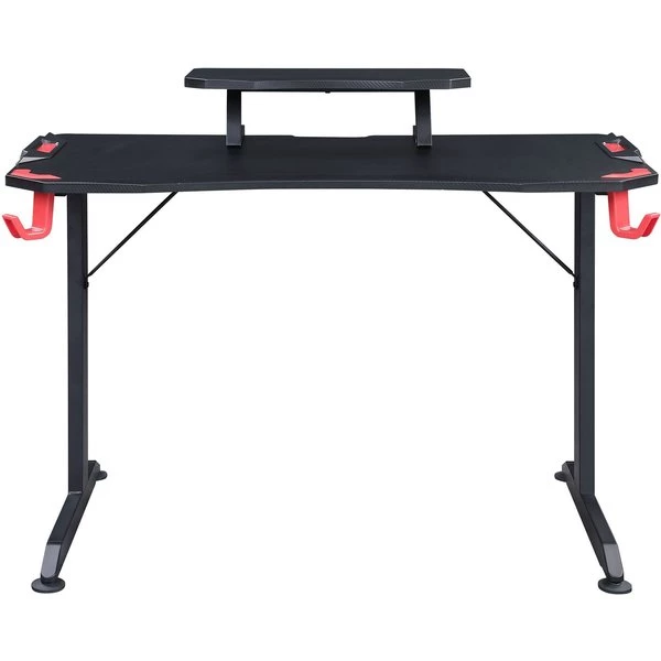 Gaming desk offers plenty of space and a specialized design to accommodate your gaming gear. Set up your monitor on the separate monitor shelf that holds up to 17 lb. and is removable in case you need even more space for your monitors. Medium-density fiberboard tabletop holds up to 110 lb. and features black carbon fiber-grain PVC on the surface backed with black melamine. Hang your headphones, controllers and more on the two colorful corner hooks in the front for easy access. Cable-management shelf in the back helps you manage your power needs with room enough for a surge protector. Steel tube legs and base with powder coating support the gaming desk for a reliable foundation.
