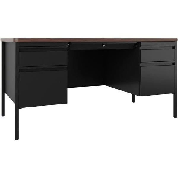 Fortress Series Teachers Desks offer a practical and professional desk solution ideal for educational offices and classrooms. Durable. high-quality steel construction in black withstands rigorous daily use. The durable tops feature T-mold edges to promote safety and high-performance laminate. Classic Walnut surface that is scratch-resistant. stain-resistant and water-resistant. Mobile desks are also equipped 3/4 modesty panels. locking center drawers and box/file pedestals with full-extension. ball-bearing slides. Integrated drawer pulls are full-width. Central lock system locks all drawers. Reinforced. double-frame inner structure keeps desk solid and sturdy for years of use. Steel desking meets or exceeds ANSI/BIFMA standards. FeaturesFortress Series Walnut Top Teachers DeskTired with disorganized working area!With generous work surface and multiple drawers this pedestal deskIdeal & stylish look for your officeThis durable pedestal desk offers comfort and durabilitySturdy and durable steel frameSpecificationsColor: BlackDimension: 60" x 30" x 29.5"