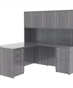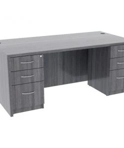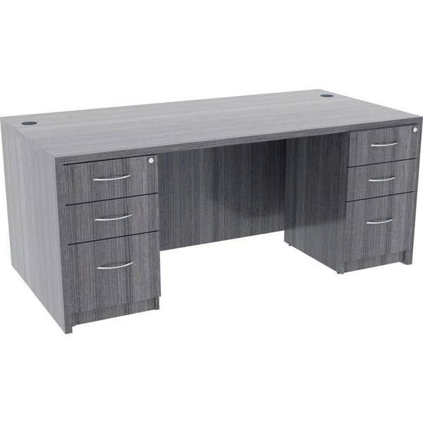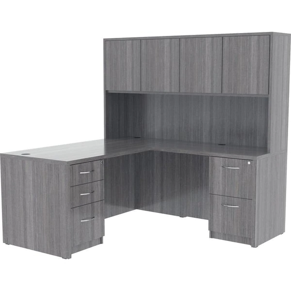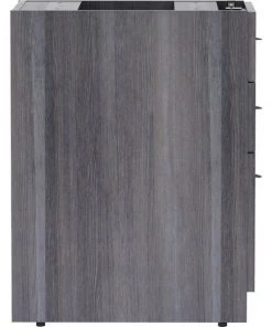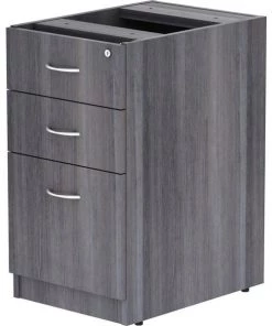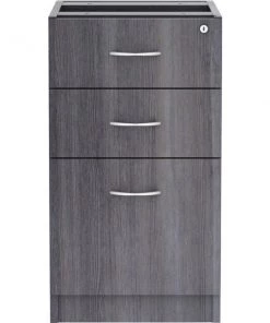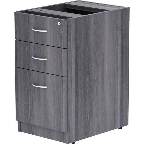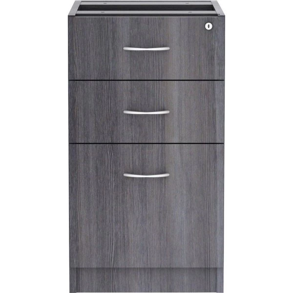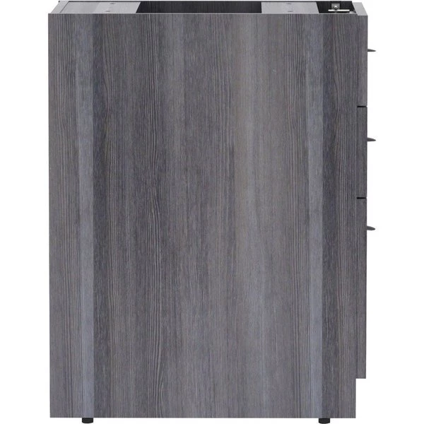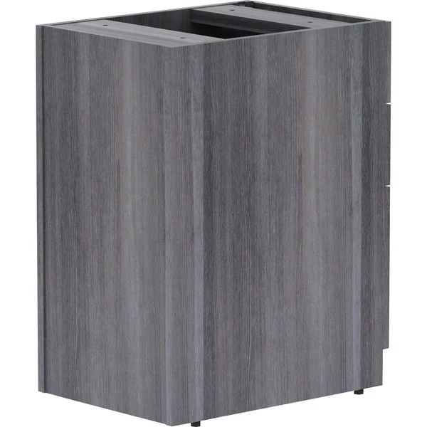Unfinished pedestal is part of Lorell Essentials Series Laminate Furniture with high-quality, Weathered Charcoal laminate construction. Pedestal offers a box/box/file design to store office supplies and important files. The file drawer includes hangrails and holds letter-size and legal-size hanging files. Design also includes 96mm metal drawer pulls with a silver brush finish and 3mm PVC edges. Pedestal should not be used with a top (sold separately). It attaches to the underside of the top of an Essentials Series desk, credenza or return with the included fasteners and extends to the floor. Adjustable floor guides offer stabilization.