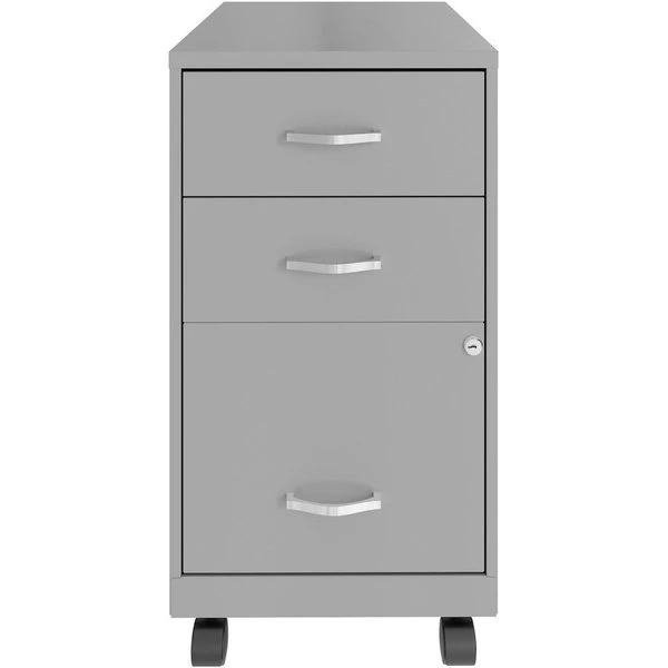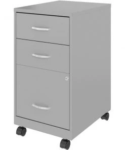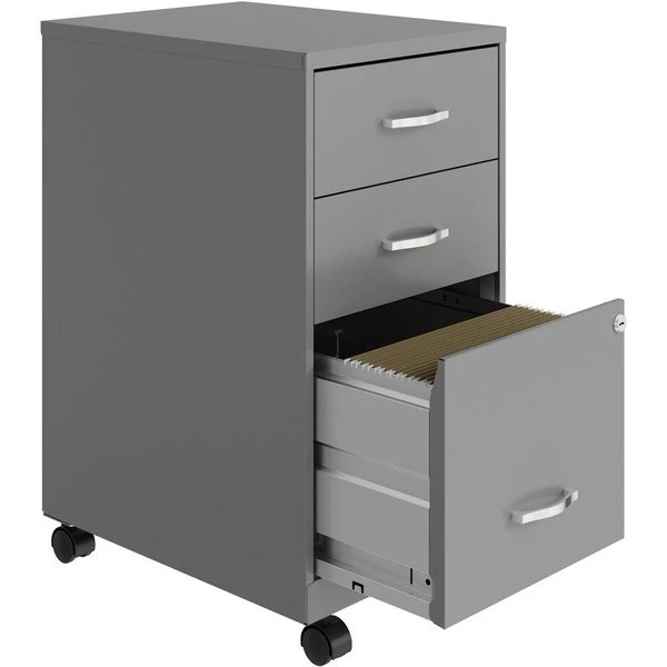 Part of the Lorell SOHO Collection, this 3-Drawer Organizer Metal File Cabinet is perfect for storing files, supplies and accessories for your small office or home office. With one file drawer and two storage drawers, it features a smart, efficient design that works well in small spaces and fits under most worksurfaces or desks. Each drawer features high sides to accommodate letter-size hanging files. Store your office essentials in the top two accessory drawers. The included four wheels are both stylish and functional, making it easy to move around your home or office. With the wheels, the file cabinet is 24-1/2" high. Using a patented glide suspension, the drawers have a smooth open and close slide with a 3/4 drawer extension to prevent tipping. Built-in lock for the bottom two drawers keeps your files and select possessions secure.