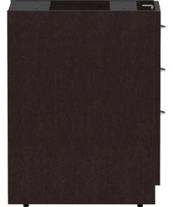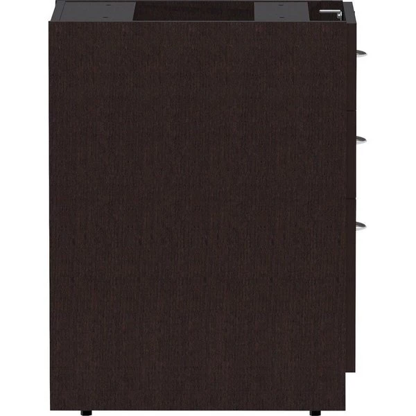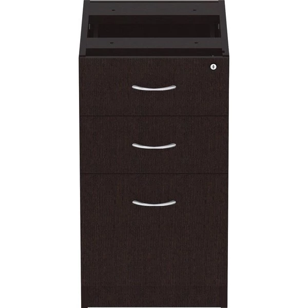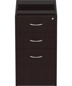Fixed pedestal is part of Lorell Essentials Series Laminate Furniture with high-quality, Espresso laminate construction. Pedestal offers a box/box/file design to store office supplies and important files. The file drawer includes hangrails and holds letter-size and legal-size hanging files. Design also includes 96mm metal drawer pulls with a silver brush finish and 3mm PVC edges. Pedestal attaches to the underside of the top of an Essentials Series desk, credenza or return with the included fasteners and extends to the floor. It does not have a top and should not be used alone.