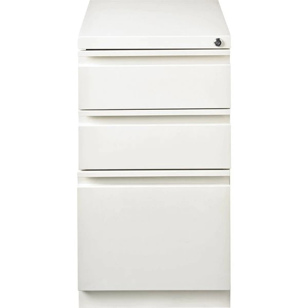 Mobile pedestal file features a high-side file drawer with full extension for great access to your frequently accessed files and two box drawers for small supply storage. Steel ball-bearing, drawer suspension delivers smooth drawer opening and closing. Factory-installed, core-removable lock keeps your letter-size files secure. Drawer pull extends across the entire, recessed drawer front for easy access. Casters are hidden from view and move the pedestal easily when necessary. Pedestal with a white finish is made of steel and offers the perfect depth to slide easily into your cubicle or other office configuration. Mobile pedestal file meets or exceeds applicable ANSI/BIFMA standards.