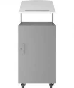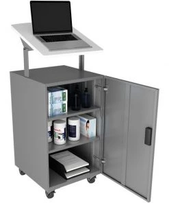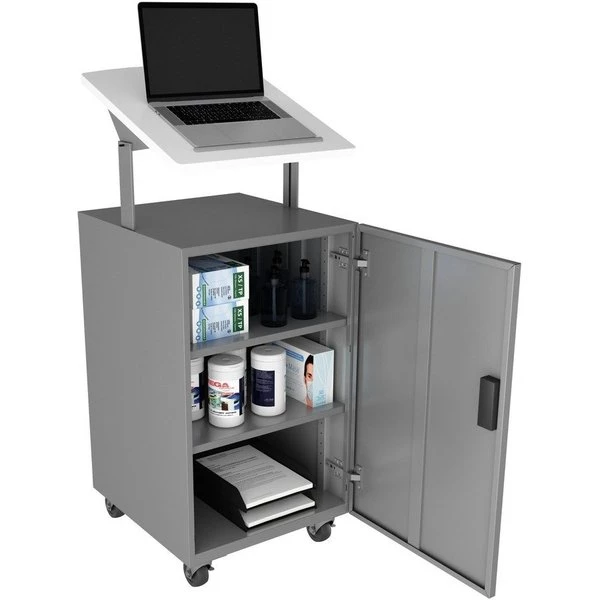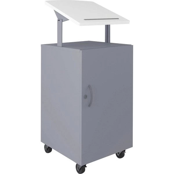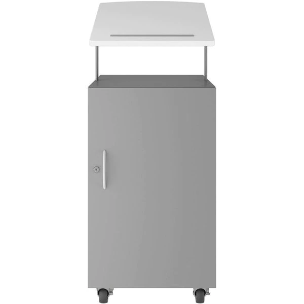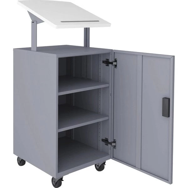 Mobile Podium provides a locking storage space for any classroom or presentation space. Two adjustable shelves and one fixed shelf offer flexible organizing of presentation materials and more behind a locking door. Adjustable-height, tilted, T-mold laminate top lets you adjust to your comfort. T-mold edge creates rounded corners to avoid sharp edges. Four industrial casters (two locking) smoothly roll the podium to the optimal location whether in front of your audience or out of the way for group activities. Green Gold Certified podium meets or exceeds ANSI/BIFMA standards.
