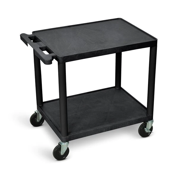 Made in the USA this sturdy two-shelf AV cart is designed to hold and haul up to 300 lbs. of equipment. Made of molded plastic the durable shelves and legs won't scratch dent rust or stain. Shelves also feature a .25" retaining lip to prevent contents from sliding off. Maneuvering the cart when empty or fully loaded is easy thanks to four 4" full-swivel casters (two with locking brake) and an ergonomic push handle molded into the top shelf.