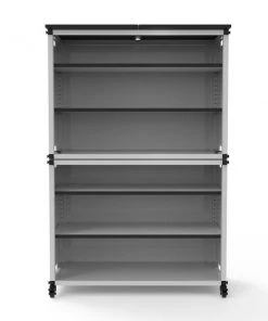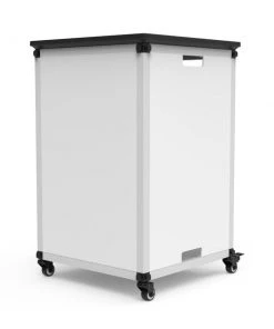 At 27" high this utility cart is designed for transporting heavy audio/visual equipment. Its sturdy construction holds up to 400 lbs. on two flat shelves while the four 4" full-swivel casters (two with locking brake) make the cart easy to maneuver. An ergonomic push handle molded into the top shelf provides greater control and the .25" retaining lip on each shelf keeps contents from sliding off. The cart is incredibly durable with the shelves and legs being made of molded plastic that won't scratch dent rust or stain.
