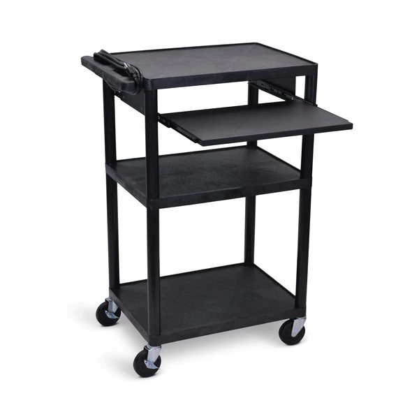 This heavy-duty AV cart allows you to support and transport up to 300 lbs. All three shelves offer a .25" retaining lip to secure items in place and are made of high-density polyethylene plastic that won't scratch dent rust or stain. The middle and bottom shelves offer 14" and 17.75" of clearance respectively providing ample space for AV equipment and accessories. The molded push handle built into the top shelf provides greater control when moving the cart while four 4" heavy-duty full-swivel casters with two locking brakes provide easy maneuverability.