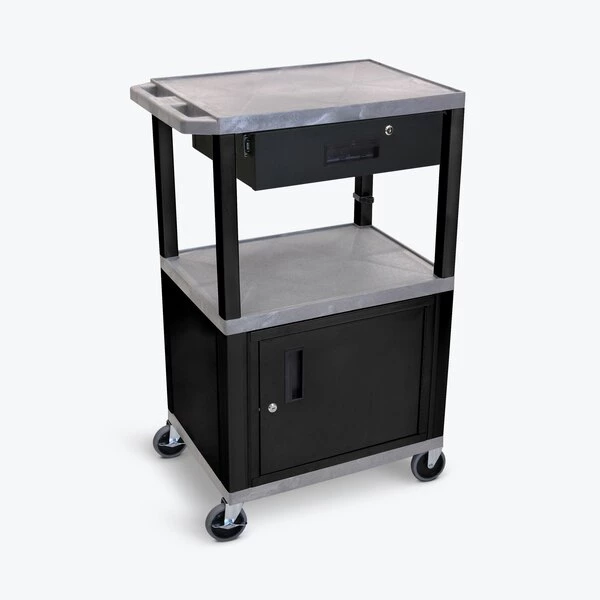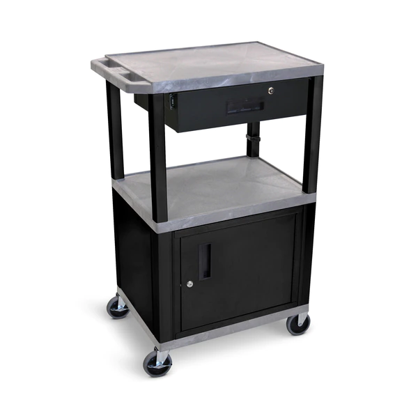 42"H AV Cart, 3 Shelves, Cab, Drawer, Black Leg