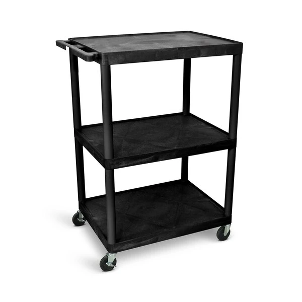 The Luxor 48"H AV Cart offers three large shelves with ample clearance for storing and transporting up to 400 lbs. of AV equipment and more. All three shelves offer a .25" retaining lip to secure items in place and are made of molded plastic that won't scratch dent rust or stain. This mobile cart also