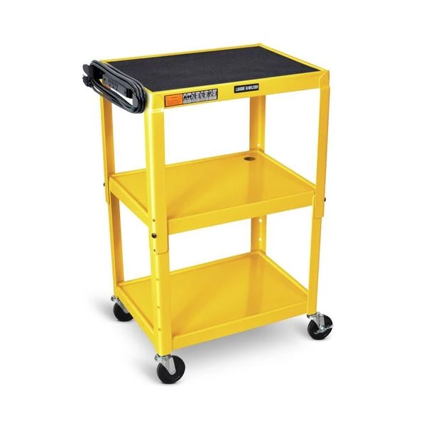 Luxor Adjustable Height Yellow Metal A/V Cart This popular multipurpose utility cart will securely store and transport your valuable electronic equipment from room to room. The steel construction and robotically welded shelves ensure long-lasting durability in tough environments. Textured mats and retaining lips keep shelf contents securely in place while the adjustable top shelf can be set from 24" to 42"-thick and includes a three-outlet electrical assembly for convenient power access. This mobile cart is also easy to maneuver and can be quickly stabilized thanks to four 4" full-swivel casters, two with locking brakes. FEATURES: Adjustable height from 24" to 42" in 2" increments Roll-formed shelves with .25" retaining lip Tables are robotically welded for stability Powder coat painted finish Rolling cart with 4" silent-roll, full-swivel ball bearing casters, two with locking brake Three-outlet, 15' UL- and CSA-Listed electrical assembly with cord plug snap and side-wrap hooks Easy-access cable holes keep the cart organized Includes safety mat Available with locking steel cabinet and/or drop leaf side shelves Multiple color options Assembly required Made in the USA DIMENSIONS: Overall: 24"W x 18"D x 24 to 42"H in 2" increments