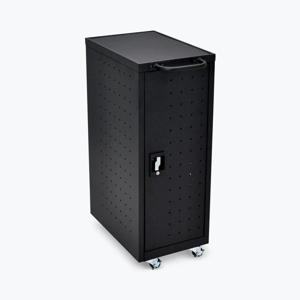Luxor Black 12 Chromebook Charging Cart Includes Electrical Outlets At only 14" wide, this slender charging cart provides a space-saving solution for keeping laptops and Chromebooks fully charged and safely stored. Solid steel construction provides strong protection and, like all Luxor charging carts, rubber-coated dividers that wonâ€TMt scratch devices and provide impact protection during transit. Its four casters make it easy to move from location to location and assembly is simple – just attach the casters and handle and youâ€TMre ready to roll.