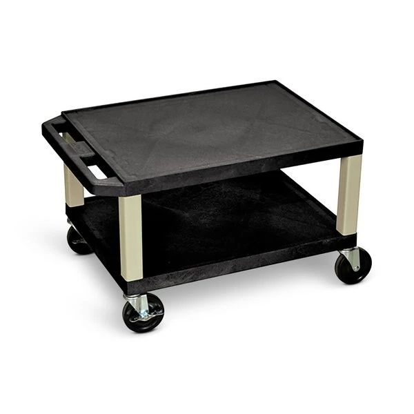 This 16"-high rolling AV cart offers two 1.5" thick shelves to support and transport audio/video equipment and more. Both shelves offer a textured surface and a .25" retaining lip to help contain contents and are made from molded plastic that won't chip warp scratch rust or peel. Square legs provide sturdy support and four 4" heavy-duty casters (two with locking brake) allow for easy mobility.