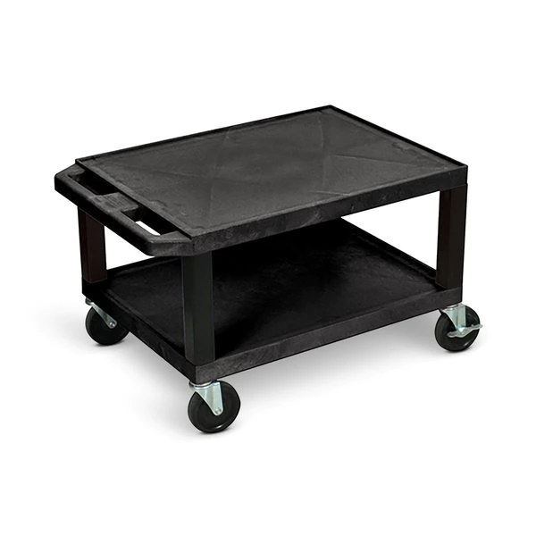 This 16"-high rolling AV cart offers two 1.5" thick shelves to support and transport audio/video equipment and more. Both shelves offer a textured surface and a .25" retaining lip to help contain contents and are made from molded plastic that won't chip warp scratch rust or peel. Square legs provide sturdy support and four 4" heavy-duty casters (two with locking brake) allow for easy mobility.