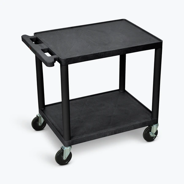 Luxor Black 2 Shelf A/V Cart 26" H Made in the USA, this sturdy, two-shelf AV cart is designed to hold and haul up to 400 lbs. of equipment. Made of molded plastic, the durable shelves and legs won't scratch, dent, rust or stain. Shelves also feature a .25" retaining lip to prevent contents from sliding off. Maneuvering the cart when empty or fully loaded is easy thanks to four 4" full-swivel casters (two with locking brake) and an ergonomic push handle molded into the top shelf.