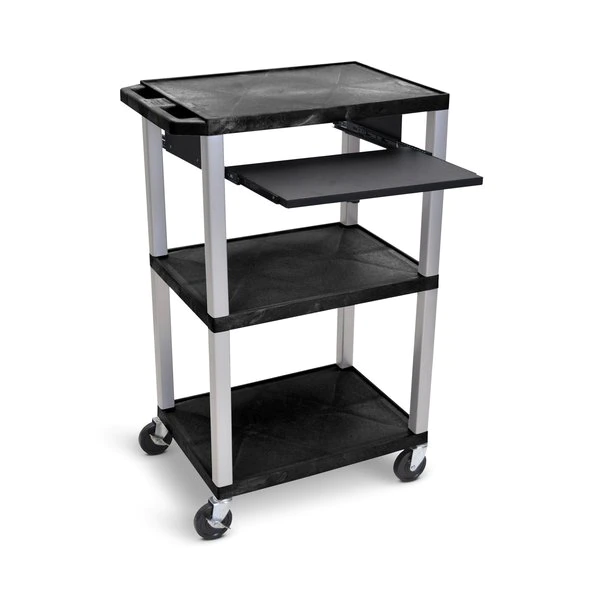 In addition to three 1.5"-thick molded plastic shelves that won't scratch dent rust or stain this durable AV cart has a front pullout tray that's ideal for supporting a keyboard or laptop as well as a three-outlet recessed electrical assembly for convenient power access. The three primary shelves have a textured surface and .25" retaining lip to help secure items and a molded push handle for easy maneuverability. Four 4" full-swivel casters make it easy to roll the cart from location to location and two locking brakes allow you to quickly stabilize the cart when needed. Its strength utility and mobility make this cart perfect for use with audio/video equipment.