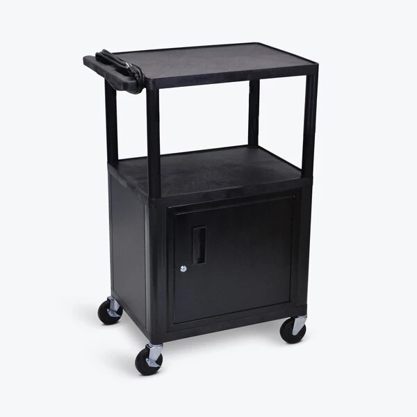 Luxor Black Endura 3 Shelf A/V Cart with Cabinet This 42" AV Cart is ideal for storing and transporting audio/video equipment and more. Three durable shelves are made from a molded plastic that will not stain scratch, dent or rust, and can hold up to 300 lbs. in total. The top shelf has an ergonomic handle molded into it for greater control during transit as well as a three-outlet UL-Listed electrical assembly with integrated cord wrap to provide convenient access to power. This rolling cart also features four 4" full-swivel casters, two with locking brake, for mobility and stability.