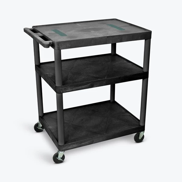 Luxor Black Endura Cart with 3 Shelves A multi-tiered design and 400 lb. weight capacity make this AV cart ideal for holding and transporting heavy equipment. All three shelves offer a .25" retaining lip to secure items in place and are made from a molded plastic that won't stain, scratch, dent or rust. Four 4" full-swivel casters, two with locking brake, provide smooth maneuverability, and an ergonomic handle molded into the top shelf with integrated three-outlet UL-Listed electrical assembly offers convenient access to power.