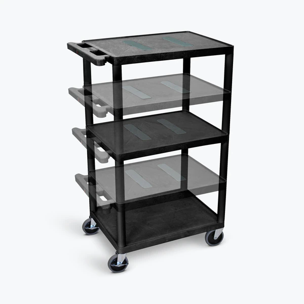 Luxor Black Endura Multi-Height 3 Shelf A/V Cart Choose your AV cart height with this versatile option from Luxor. It includes multiple leg sets allowing you to construct a 16"H two-shelf cart or a three-shelf cart up to 41"H capable of transporting up to 400 lbs. All three shelves and legs are made from molded plastic that won't scratch, dent, rust or stain, and each shelf features a .25" retaining lip to keep items from sliding off. A push handle molded into the top shelf and four 4" heavy-duty casters with two locking brakes provide smooth maneuverability and quick stability when needed.