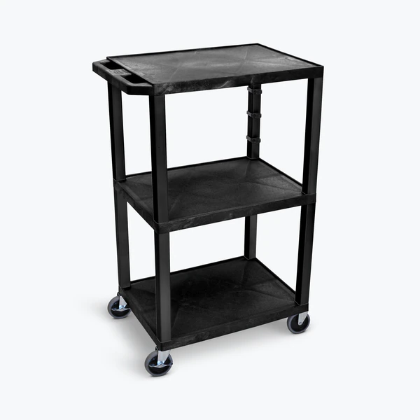 Luxor Black Tuffy 3 Shelf 42" AV Cart with Electric Made from recycled molded plastic, this durable AV cart will not scratch, dent, rust or stain. Each of the three 1.5"-thick flat shelves has a .25" retaining lip and a textured surface to keep contents from sliding during use or transport. The top shelf has a recessed, three-outlet UL-Listed electrical assembly for convenient power access. Square legs provide sturdy support and four 4" ball bearing casters (with two locking brakes) coupled with a push handle molded into the top shelf allow easy transport from place to place. FEATURES: Multipurpose utility cart perfect for use with audio/video equipment and more Made of recycled molded plastic shelves that will not chip, warp, scratch, rust or peel Three 1.5"-thick flat shelves with raised, textured surface to ensure minimal sliding .25" retaining lip borders flat shelves Legs measure 1.5" square Ergonomic push handle molded into top shelf for easy maneuverability Rolling cart with four 4" silent-roll, full-swivel heavy-duty casters, two with locking brake Three-outlet UL-Listed recessed electrical assembly with 15' cord, built-in cord wrap and three cable management clips Available with storage drawer and/or locking steel cabinet Multiple color options Assembly required Made in the USA DIMENSIONS: Overall: 24"W x 18"D x 42.5"H Cord: 15'