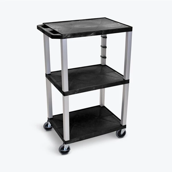 Luxor Black Tuffy 3 Shelf 42" AV Cart with Nickel Legs Made from recycled molded plastic, this durable AV cart will not scratch, dent, rust or stain. Each of the three 1.5"-thick flat shelves has a .25" retaining lip and a textured surface to keep contents from sliding during use or transport. Square legs provide sturdy support and four 4" ball bearing casters (with two locking brakes) coupled with a push handle molded into the top shelf allow easy transport from place to place.