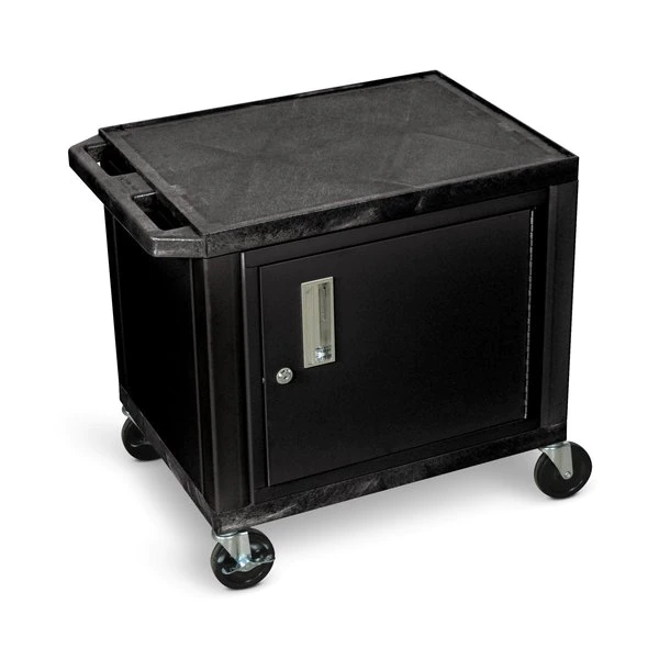 Whether you're looking for a basic AV cart or a multipurpose utility cart this mobile cart is built to last. The two shelves are made from durable thermoplastic resin that won't chip warp scratch rust or peel. They also have a textured surface and .25" retaining lip. There's a locking cabinet to store and secure audio/video equipment a push handle molded into the top shelf for greater control and four heavy-duty casters to provide smooth mobility across a variety of surfaces. Need to stabilize the cart? Simply activate the two locking brakes. Plus it's proudly made in the USA.