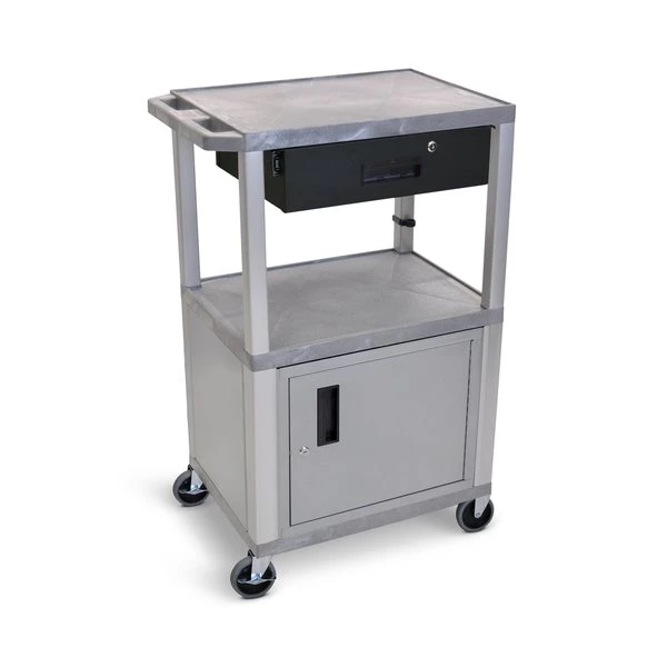 Made from recycled molded plastic this durable AV cart will not scratch dent rust or stain. Each of the three 1.5"-thick flat shelves has a .25" retaining lip and a textured surface to keep contents from sliding during use or transport. This cart includes a 20-gauge steel locking cabinet for storing equipment a locking drawer for holding accessories and has a recessed three-outlet electrical assembly for convenient power access. Square legs provide sturdy support and four 4" ball bearing casters (with two locking brake) coupled with a push handle molded into the top shelf allow easy transport.
