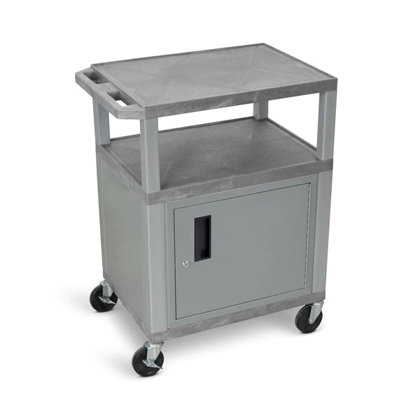 Made in the USA this versatile AV cart has durable shelves made of molded plastic that won't chip warp scratch rust or peel. Each shelf has a .25" retaining lip to help secure items and the top shelf has a recessed three-outlet UL-Listed electrical assembly. The cart includes a 20-gauge steel locking cabinet to store equipment. Square legs provide structural strength while four 4" full-swivel casters (two with locking brake) along with a push handle molded into the top shelf make this cart easy to maneuver.