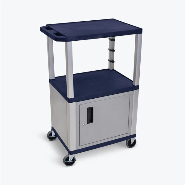 Luxor Navy Blue Tuffy 3 Shelf 42" AV Cart with Nickel Legs, Cabinet & Electric Made from recycled molded plastic, this durable AV cart will not scratch, dent, rust or stain. Each of the three 1.5"-thick flat shelves has a .25" retaining lip and a textured surface to keep contents from sliding during use or transport. This cart includes a 20-gauge steel locking cabinet for storing equipment and has a recessed, three-outlet UL-Listed electrical assembly for convenient power access. Square legs provide sturdy support and four 4" ball bearing casters (with two locking brake), coupled with a push handle molded into the top shelf, allow easy transport.
