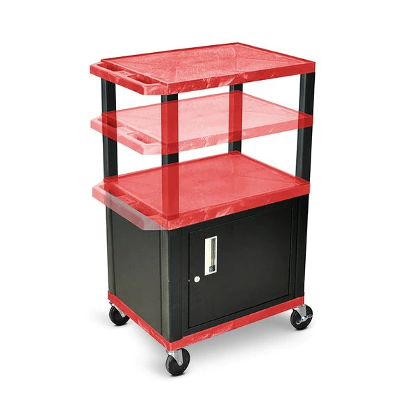 Accommodate your AV storage and transporting needs with this multipurpose multi-height cart. Three shelves are made from durable thermoplastic resin that won't chip warp scratch rust or peel and they have a textured surface as well as a .25" retaining lip to help secure items. The cart includes multiple leg sets to construct height options from 24.5" to 42" as well as a durable 20-gauge steel locking storage cabinet and built-in three-outlet electrical assembly. A push handle molded into the top shelf provides greater control while four heavy-duty casters provide smooth mobility across a variety of surfaces and two locking brakes let you quickly stabilize the cart.