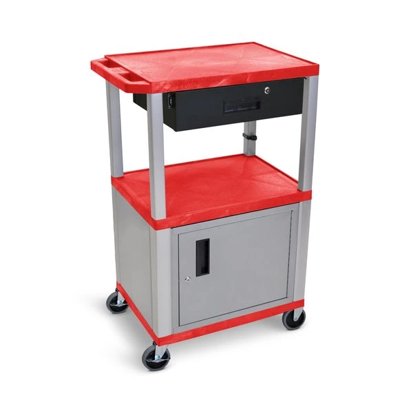 Made from recycled molded plastic this durable AV cart will not scratch dent rust or stain. Each of the three 1.5"-thick flat shelves has a .25" retaining lip and a textured surface to keep contents from sliding during use or transport. This cart includes a 20-gauge steel locking cabinet for storing equipment a locking drawer for holding accessories and has a recessed three-outlet electrical assembly for convenient power access. Square legs provide sturdy support and four 4" ball bearing casters (with two locking brake) coupled with a push handle molded into the top shelf allow easy transport.