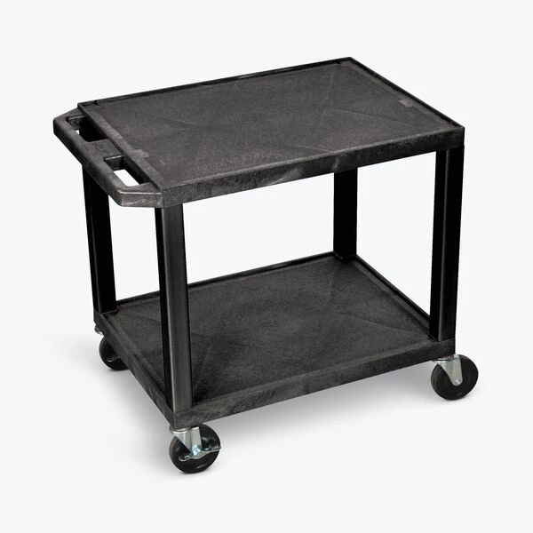 Luxor Tuffy Black 2 Shelf AV Cart with Electric Whether you're looking for a basic AV cart or a multipurpose utility cart, this mobile cart is built to last. Its two shelves, with a textured surface and .25" retaining lip to help secure items, are made from durable thermoplastic resin that won't chip, warp, scratch, rust or peel. A push handle is molded into the top shelf for greater control and includes a built-in three-outlet electrical assembly while four heavy-duty casters provide smooth mobility across a variety of surfaces. Need to stabilize the cart? Simply activate the two locking brakes. Plus, it's proudly made in the USA. FEATURES: Multipurpose utility cart perfect for use with audio/video equipment and more Made of recycled molded plastic shelves that will not chip, warp, scratch, rust or peel Two 1.5"-thick flat shelves with raised, textured surface to ensure minimal sliding .25" retaining lip borders flat shelves Legs measure 1.5" square Ergonomic push handle molded into top shelf for easy maneuverability Rolling cart with four 4" silent-roll, full-swivel heavy-duty casters, two with locking brake Includes recessed three-outlet UL-Listed electrical assembly Available with 20-gauge steel locking cabinet Multiple color options Assembly required Made in the USA DIMENSIONS: Overall: 24"W x 18"D x 24.5"H