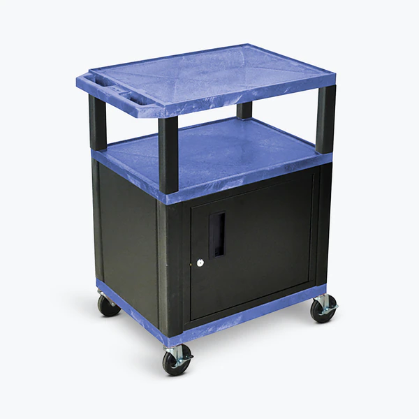 Luxor Tuffy Blue 3 Shelf AV Cart with Black Cabinet & Electric Made in the USA, this versatile AV cart has durable shelves made of molded plastic that won't chip, warp, scratch, rust or peel. Each shelf has a .25" retaining lip to help secure items and the top shelf has a recessed three-outlet UL-Listed electrical assembly. The cart includes a 20-gauge steel locking cabinet to store equipment. Square legs provide structural strength while four 4" full-swivel casters (two with locking brake), along with a push handle molded into the top shelf, make this cart easy to maneuver.