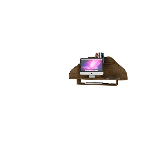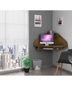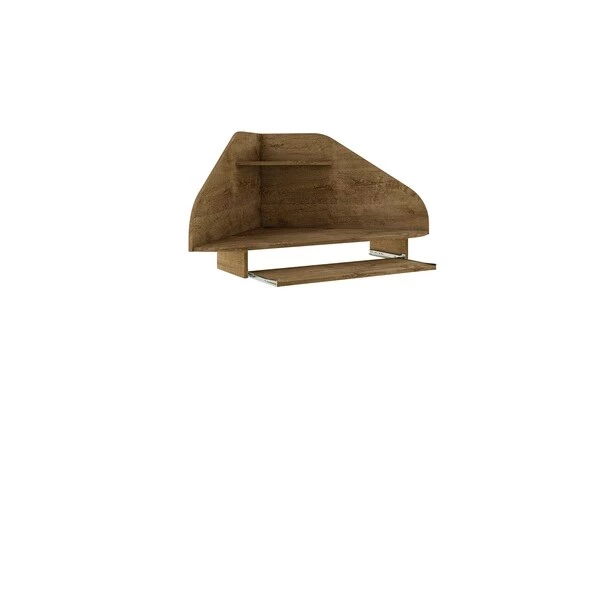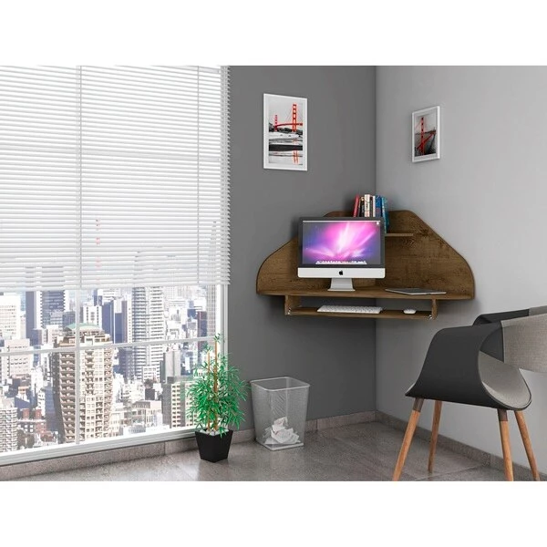 Get the job done with a desk that doesn’t cramp your workspace or compromise your space. The Bradley floating corner desk is perfect for your in-home out of the office work area with space for a desktop computer, laptop, and little shelf nook up top for keeping pens or office accessories handy. An open sliding drawer holds a keyboard or laptop, and keeps the area efficient and clean. This piece easily fits into any corner and blends seamlessly with any existing decor.