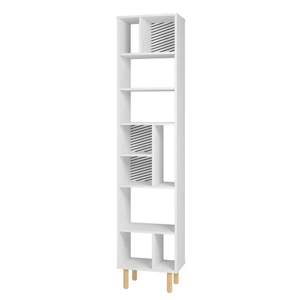Mid-Century – Modern Bookcase for Living Room and Office Use. * Upon Assembly, Measures: 17.51 in. Length, 77.95 in. Height, 11.57 in. Depth. * Includes 10 Shelves of All Different Sizes. * Unique Diagonal Zebra Back Print. * Features Solid Wood Natural Color Stump Legs for Fashion and Durability. * Perfect to Display Home Décor Items, Frames, Tchotchkes, Books, Trophies and More! * Mix and Match with Manhattan Comfort Essex Collection. * Home Assembly Required. All Hardware Included