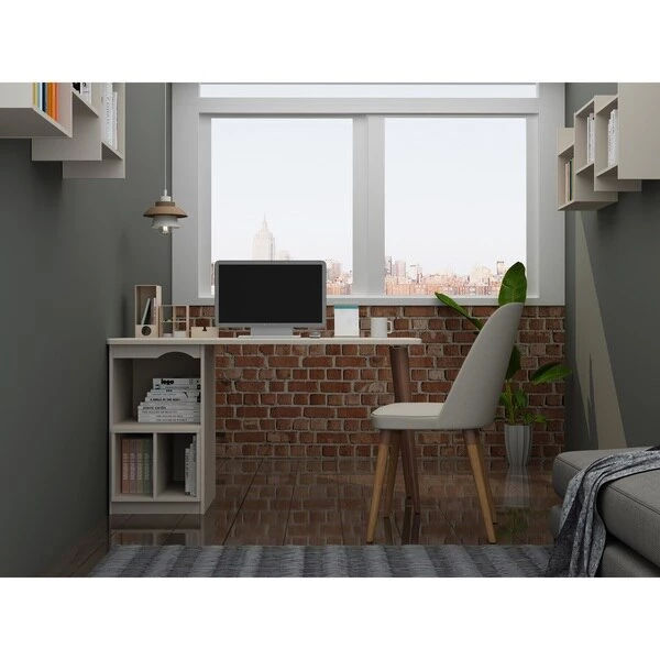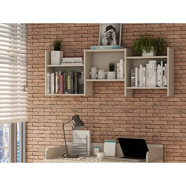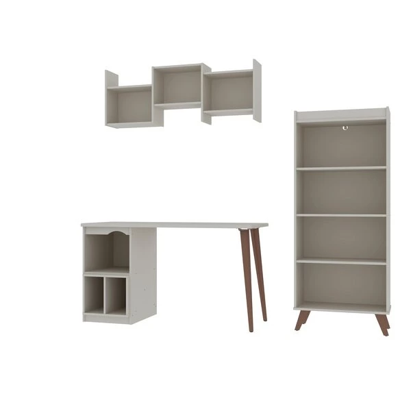 Whether you are working from home or at an office, the Hampton 3-piece set is the perfect trio to help you work like a boss and look good while checking off your tasks. A desk offers open storage at one end, perfect for tucking away files and important books or tablets, while unique craftsmanship shines with beautiful splayed legs at the other half. Mid-century modern design offers a streamlined aesthetic that easily blends with any existing decor, with a bookcase that offers plenty of open shelving and a trio of shelves that hang above with easy access to all of your items. Prop up some framed photos, a decorative lamp, or new plant to bring life into your brand-new office and make it your own.