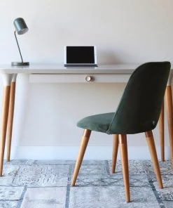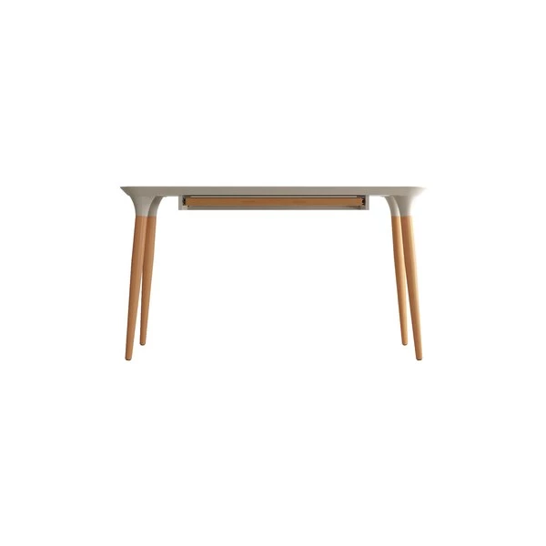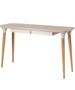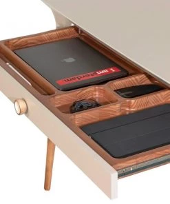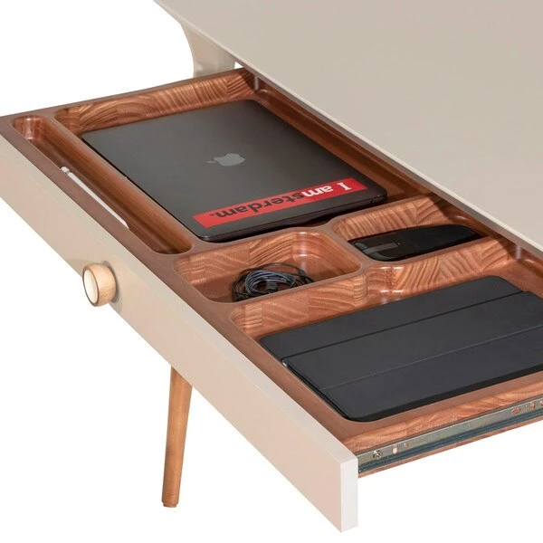 Consider this desk your most stylish spot for sparking creativity. Clean lines, natural pine, and rounded edges take this modern Scandinavian piece up a Notch. Perfect for creating a subtle workspace in a living area or tucked into a guest room to double as an unassuming end table, this piece functions however it suits the space and blends seamlessly with any existing decor. Smartly designed with all your tech needs in mind, a narrow drawer opens to reveal sectioned off areas fit for a laptop, tablets, pens, and other necessities, making it easy to tuck away electronics and personal items.