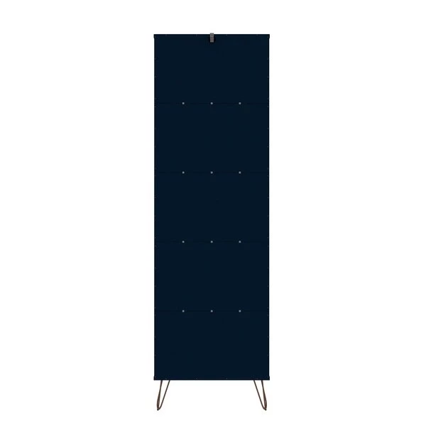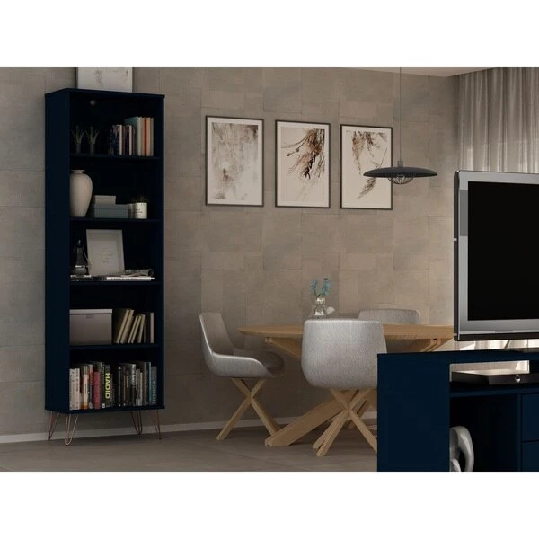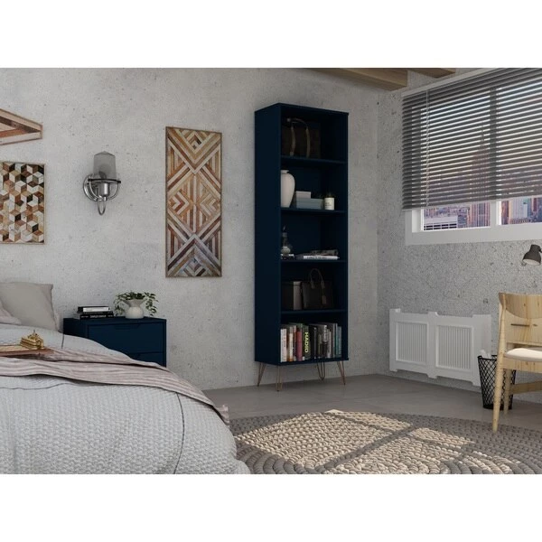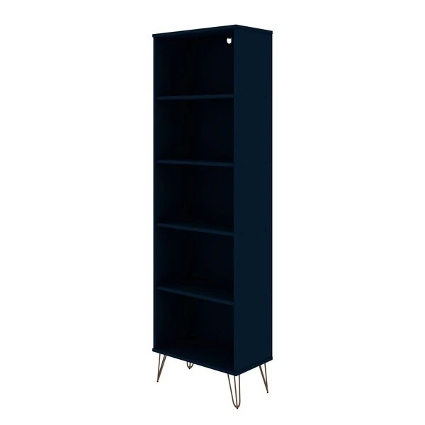 Modern, functional, and mid-century modern at its best, the Rockefeller bookcase features plenty of shelving space perfect for displaying your impressive book collection, decorative accents, and favorite framed photos. A seamless design and artful metal played legs keep this piece fresh as it moves easily from space to space and works well with any existing decor. Line up books by color in stacks, dress up the shelves with fresh florals, and use it over and over again.