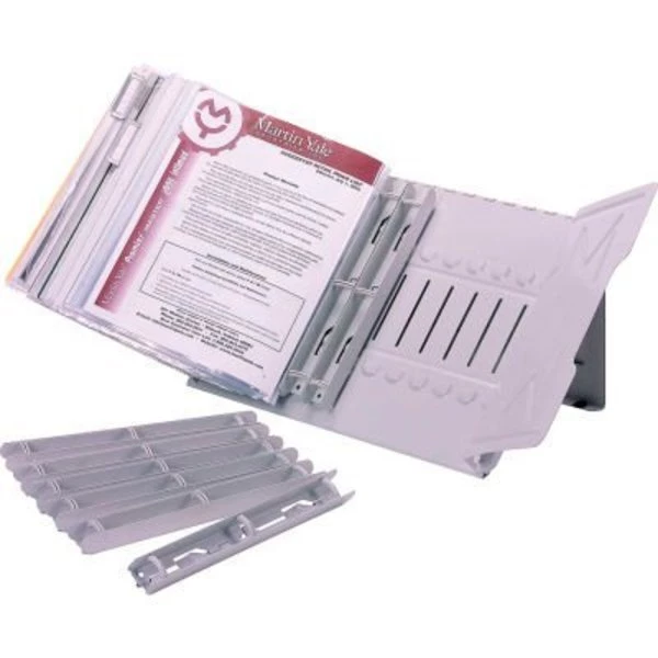 Martin yale 12" catalog rack starter set, 18"w x 25"l x 12"d complete system comes with everything needed to store and display catalogs. Hinged for fast and easy setup. Desktop racks are angled at 45 for best viewing while seated. Countertop racks are angled at 30 for best viewing while standing. Unique tongue and groove system provides easy insertion and removal of sections. Includes heavy-duty steel base and a complete set of ring sections. Non-skid feet. Available accessories include extension units, turntable, locking bar, and index sets.